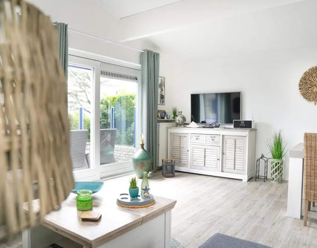Im Schlafbereich erwarten Sie zwei geschmackvoll eingerichtete Zimmer: ein Schlafzimmer mit Doppelbett und ein weiteres mit zwei Einzelbetten im maritimen Stil – ideal für Kinder. Das moderne Bad überzeugt mit Regendusche und Sunshower, die Körper und Geist gleichermaßen beleben. Das WC befindet sich in einem separaten Raum.